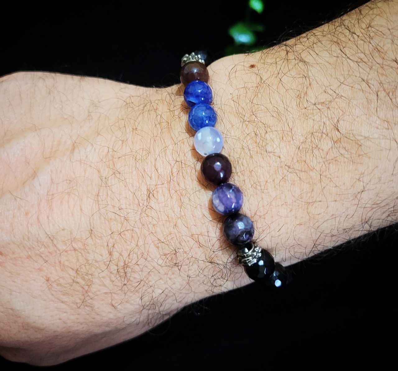 دارای ۱۴ عدد سنگ اونیکس مشکی تراش ۸ میلی متر، ۷ عدد عقیق طیف آبی، ۲ عدد خرج کار برنجی نقرهای، دارای گره کشویی