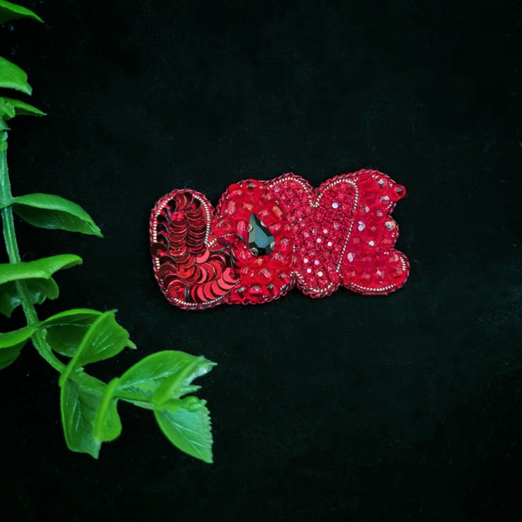 گلسینه طرح love جواهردوزی شده با پولک، مونجوق درشت، نگین متری و کریستال تراش، دوردوزی شده با پولک، پشت کار چرم و سوزن پیکسل