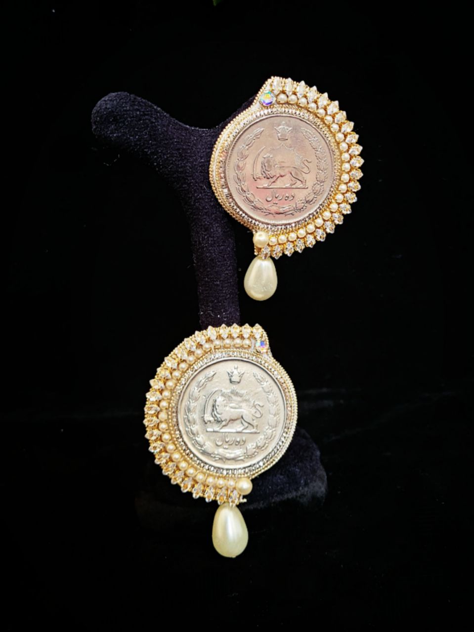 گوشواره جوهردوزی شده با سکه ۱۰ ریالی دوران پهلوی،سرمه تراش، مروارید متری،نگین مارکیز متری،مروارید اشک، دوردوزی شده با بلرسان، پشت کار چرم و میخ استیل درجه یک