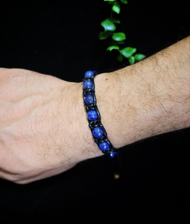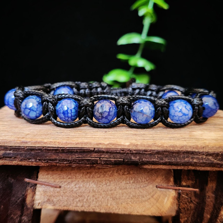 دارای ۱۱ عدد سنگ عقیق دراگون آبی، بافته شده با قیطان چرم مشکی، دارای گره کشویی