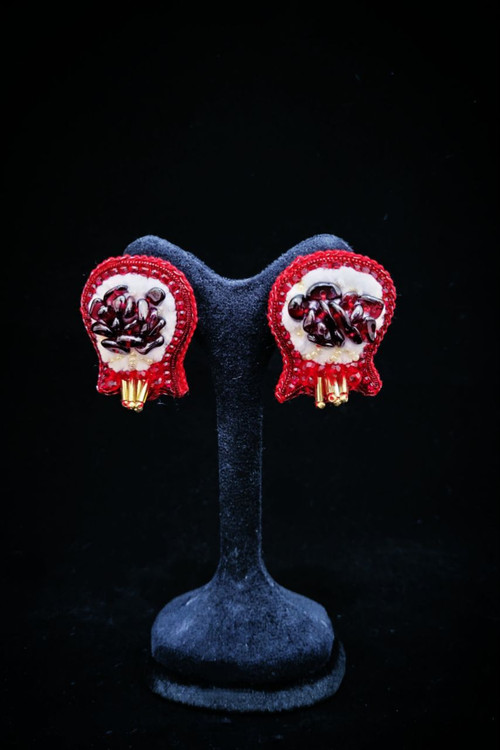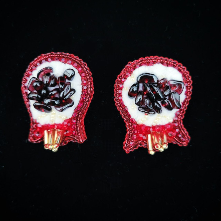 گوشواره جوهردوزی شده با نگین متری ،مخمل، سنگ گارنت، مروارید، ملیله، دوروزی شده با پولک و پشت کار چرم و میخ استیل درجه یک