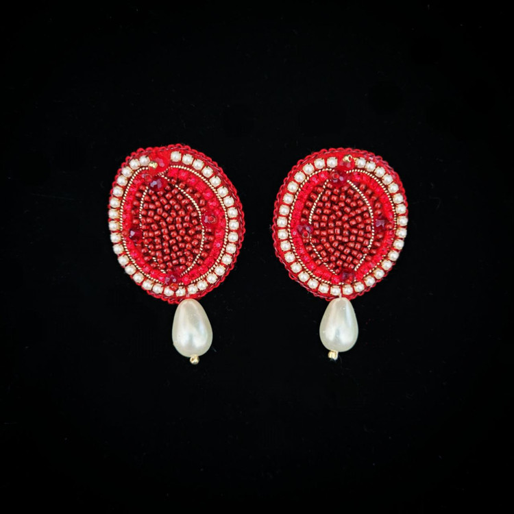 گوشواره جوهردوزی شده با مروارید، نگين متری، کریستال تراش، مونجوق، دوروزی شده با پولک و پشت کار چرم و میخ استیل درجه یک